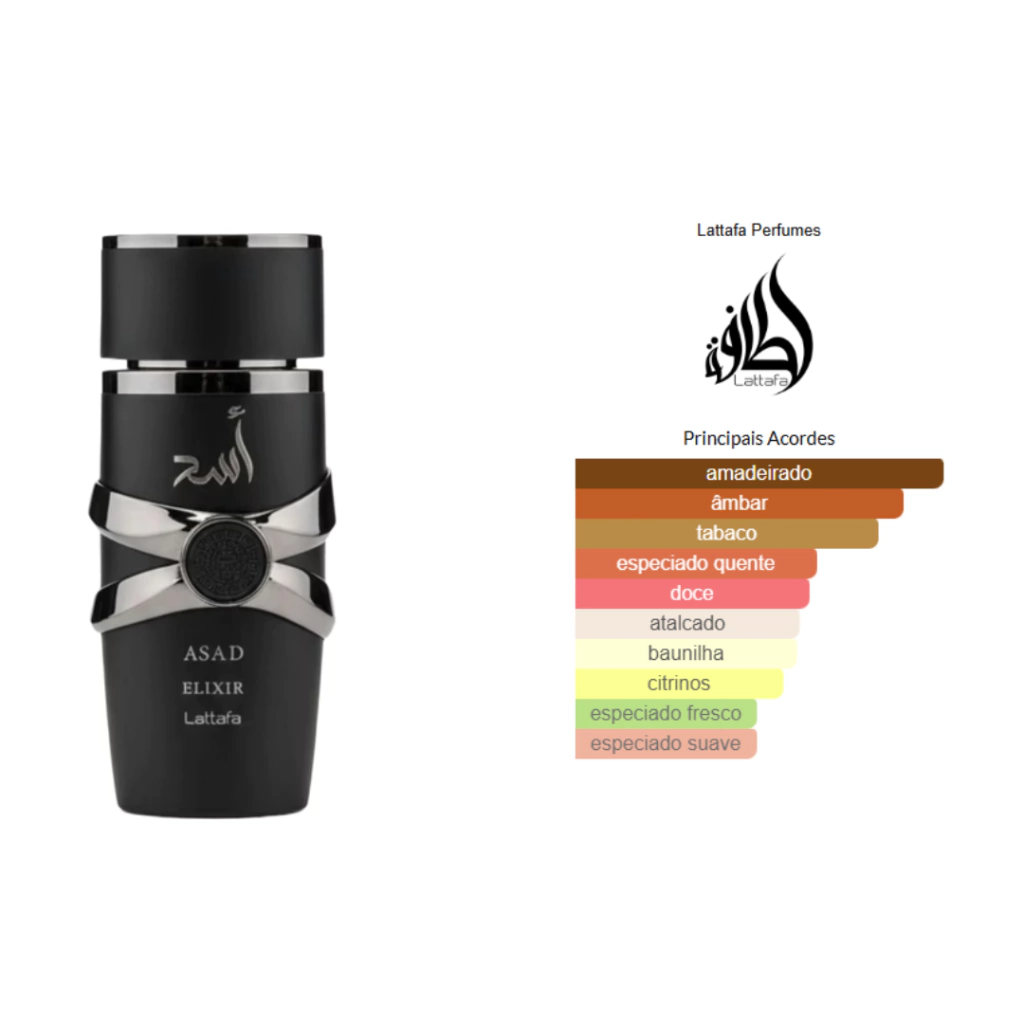 Asad Elixir de Lattafa Perfumes é um perfume Oriental Masculino. Esta é uma nova fragrância. Asad Elixir foi lançada em 2025. As notas de topo são: Toranja, Açafrão e Pimenta Rosa. As notas de coração são: Tabaco, Cedro e Baunilha. As notas de fundo são: Âmbar Claro, Olíbano, Patchouli e Cashmeran.