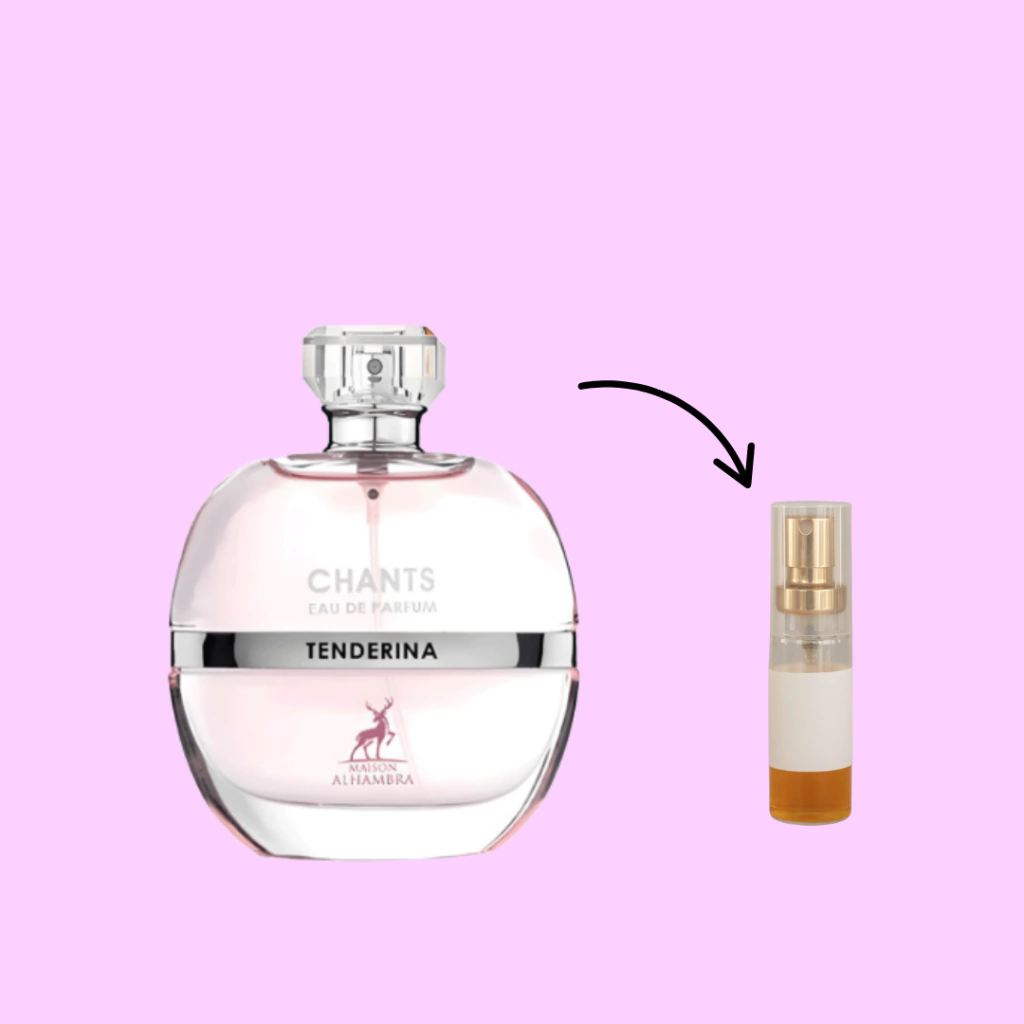 Chants Tenderina de Maison Alhambra é um perfume Floral Frutado Feminino. Chants Tenderina foi lançada em 2022. As notas de topo são: Bergamota, Flor de Toranja e Pêssego. As notas de coração são: Jasmim, Rosa e Íris. As notas de fundo são: Almíscar Branco, Vetiver, Baunilha e Patchouli.