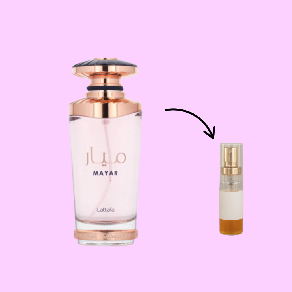 Mayar de Lattafa Perfumes é um perfume Floral Frutado Feminino. Esta é uma nova fragrância. Mayar foi lançada em 2022. As notas de topo são: Lichia, Framboesa e Folha de Violeta. As notas de coração são: Rosa Branca, Peônia e Jasmim. As notas de fundo são: Almíscar e Baunilha.
